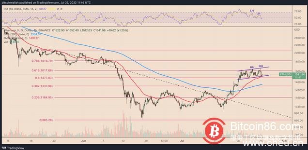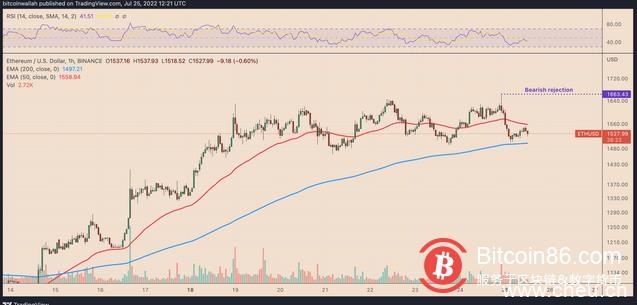 以太坊的原生代币以太币(ETH)在 7 月 26 日暴跌,降低了价格长期回升的希望。ETH/USD 下跌约 5%,随后小幅反弹至 1.550 美元以上。