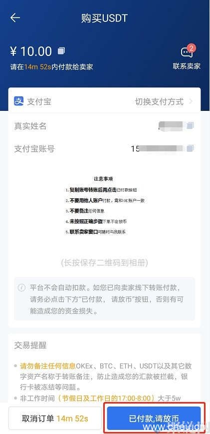 3、下单成功后,页面会显示卖家的付款方式,按照卖家的付款信息进行线下付款,打款完成后点击底部已付款,请放币即可。(成功买入一笔虚拟币之后,购买的币可以在您的法币账户里查看。)