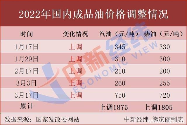 中新经纬注意到,2022年国内成品油价格已经历五轮调整。汽油价格总计上调1875元/吨,柴油价格总计上调1805元/吨,呈现“五涨零跌零搁浅”格局。若加上2021年12月31日的上调,油价则呈现“六连涨”态势。