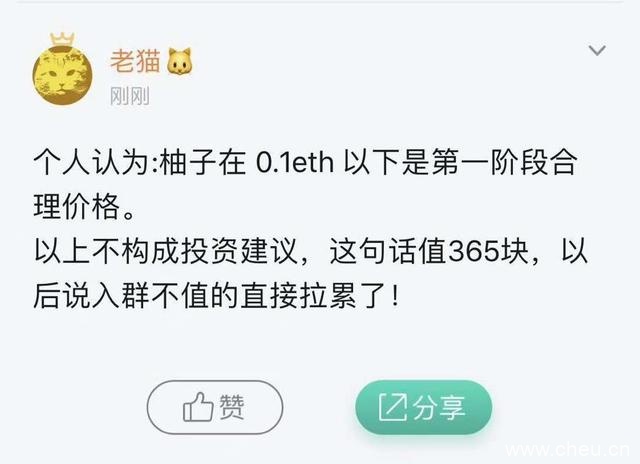 李笑来的好基友,BigOne老猫总裁在小密圈里发表了自己的豪言自语,他认为:EOS在0.1eth以下是价格合理的第一阶段。ETH就3000多元而言,EOS至少要涨到300元!(据他说,百倍币指日可待)
