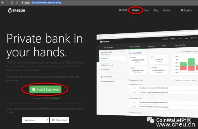2. 使用chrome浏览器(版本号大于50)访问trezor,并进入“wallet(钱包)”选项卡按照网页提示安装插件(国内可能需要翻墙才能正常安装)