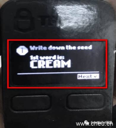 7.页面提示“Recovery seed setup”,此时用户的trezor设备会依次连续出现24个英文单词(作为备份信息),请将它们手写在备份记录卡上。这些信息将用于数据恢复,请用户务必妥善保管,同时尽量不要将这些信息上传到网上。