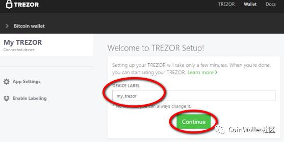 5.设置trezor设备标签,用户根据自己的喜好进行设置,并且随时可以改变它