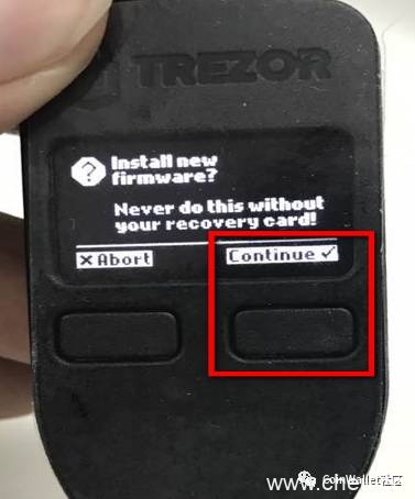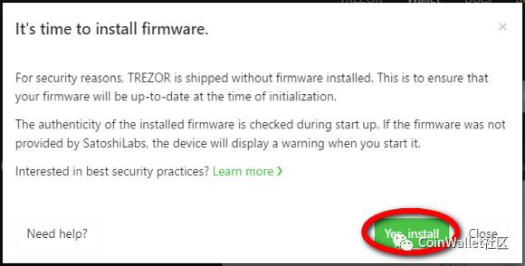 3.插件安装完之后网页会询问用户是否安装固件,此时会提示“it time to install firmware”的消息框,选择”Yes, install”,这时trezor会提示“Install new firmware?”,选择“continue”之后trezor便开始过更新固件。(可能会需要等待一点时间)