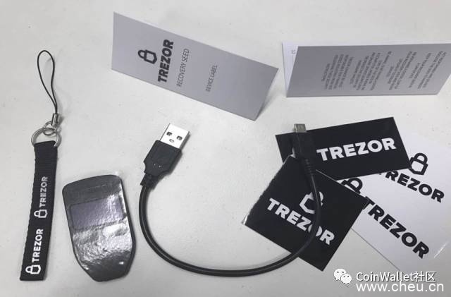 打开包装盒,发现里面有这么几个组件:一个trezor硬件钱包、一根用于连接电脑的USB数据线、一根挂绳、两种用于记录备份信息(后面会提到)的卡片、四张贴纸。