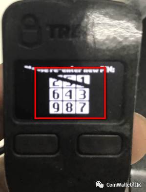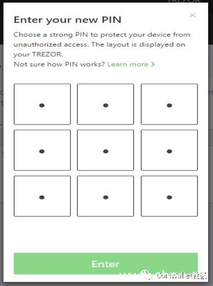 6.页面提示“Enter your new PIN”,并且会出现一个代表数字键盘却没有显示数字的九宫格,同时对应数字的布局会在trezor设备上显示。用户根据trezor数字布局在页面进行PIN码的设置(输入的密码需要具有一定的强度),确定之后会要求用户再次确认PIN码