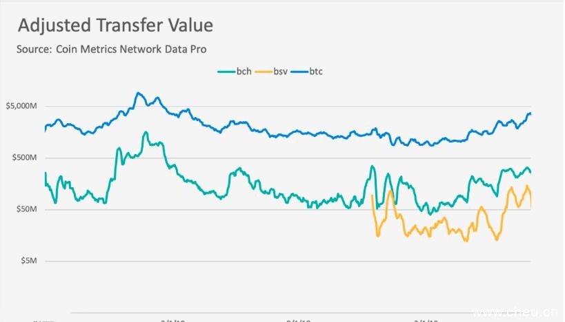 这表明BCH和BSV没有达到成为价值交换媒介的目的。相反,它们的网络越来越多地被用作存储数据的方式。虽然成本相对较高,但两个网络的转移绝对由比特币主导。Coin Metrics6月20日,比特币每日调整后转账超过35亿美元.BCH和BSV每日调整后,6月份转账量达到峰值,分别为325.5美元和1.442亿美元。