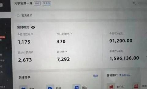 上述《元宇宙第一课》后台截图是10日左右在社交平台流传的,截图信息显示,这门课程单日新增用户370人,日活跃用户1175人,日收入超9万元,累计付费用户2673人,累计收入近160万元。