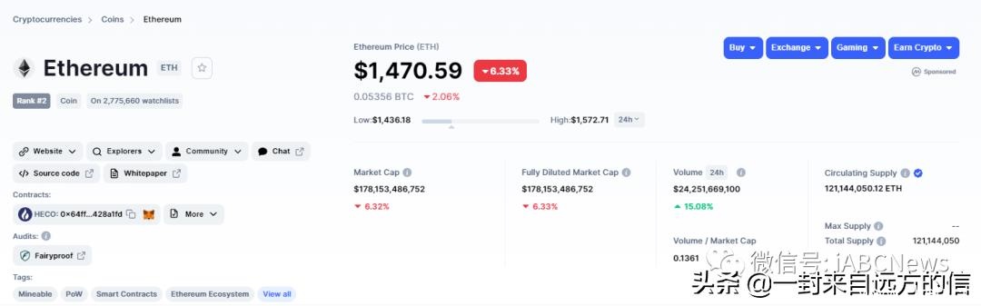 Coinbase 上的数据显示,目前,以太坊对美元的价格为 1470.59 美元,在过去 24 小时内下跌了