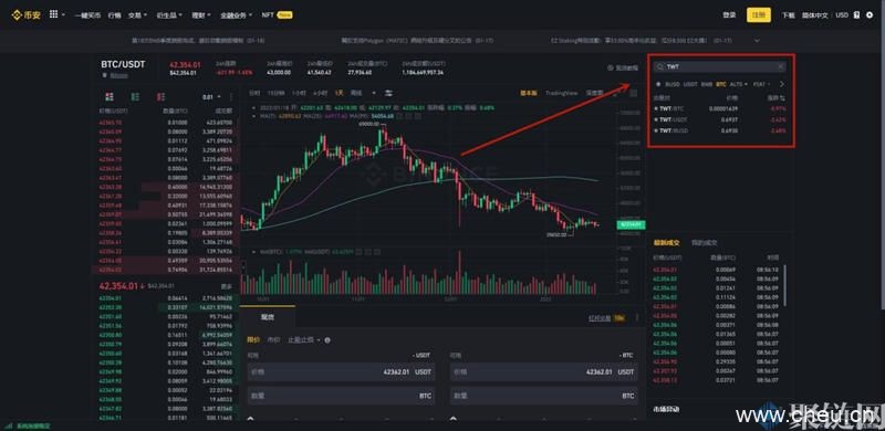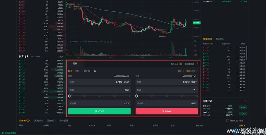 3、点击TWT\BTC交易对,在币安交易所下方会出现交易界面,这时就可以进行CVP币的交易了。