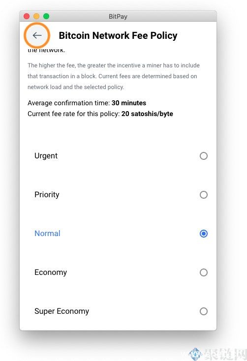 有5种政策,从紧急到超级经济。Urgent将尝试将您的交易包含在接下来的2个区块中。Super Economy将尝试在接下来的4小时内包含您的交易。您可以查看每笔费用将用于此交易的当前satoshis/byte,并决定哪种费用最适合您的情况。选择所需费用后,您可以单击左上角的返回箭头并返回主屏幕。