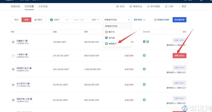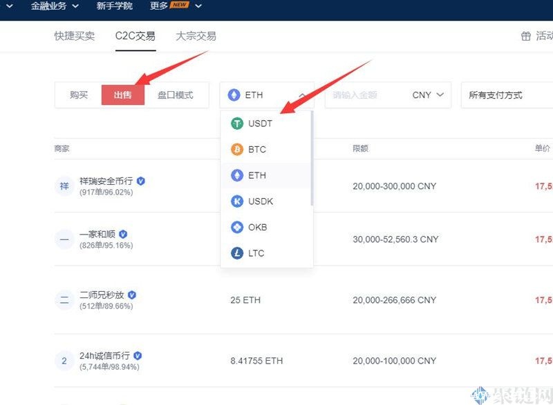 第4步、选择USDT交易,在C2C交易,选择出售USDT交易