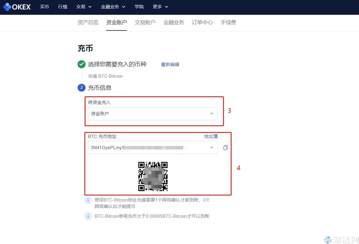 2. 选择需要充值的币种,例如BTC,点击下一步,(可以选择将资金充入账户,例如充入资金账户),接着下方会显示一个充币地址,在对方平台或者钱包向这个地址进行提现即可。