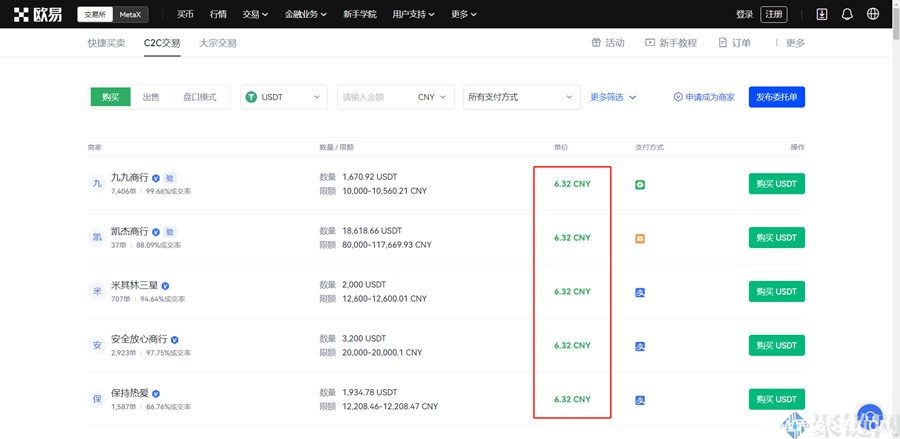 接下来再打开C2C交易,同样选择泰达币,大家就会在商家后面看到它的价格