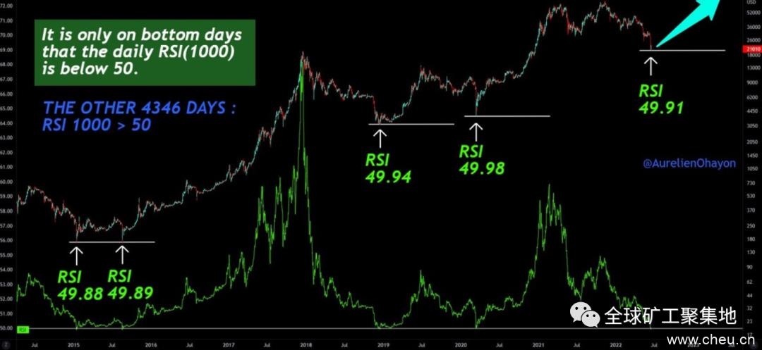 “ #Bitcoin只有在牛市运行之前的底部日子,每日 RSI(1000) 才低于 50。今天:RSI(1000)=49.91。得出结论。”