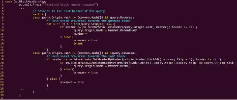 在向LES当服务器要求块头时,LES发起客户端的类型为GetBlockHeaders的消息 (message),而LES服务器的消息处理器(message handler)负责相应的分析。 图4给出geth客户负责处理GetBlockHeaders类型消息的代码片段。