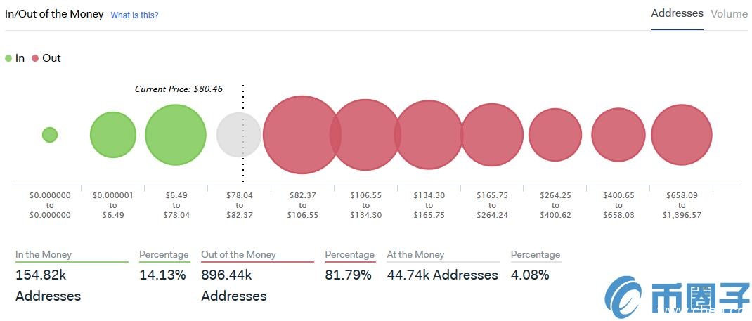 从图中可以看出,80%的以太坊地址遭受了一定的损失,而对于卡尔达诺来说,这个值是81.79%。
