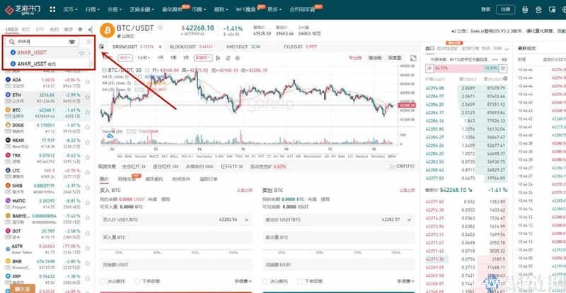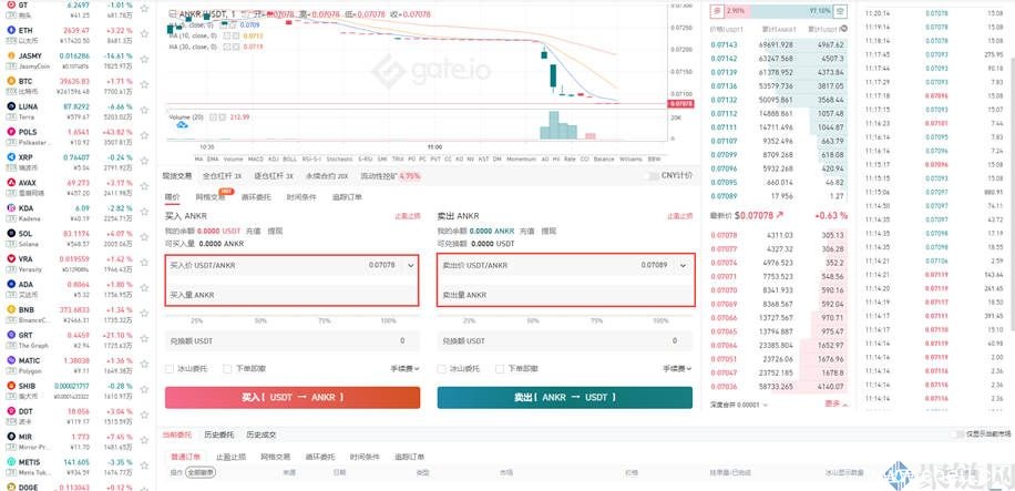 3、以ANKR\USDT为例,点击后在中下方会出现交易界面,这时就可以进行交易了
