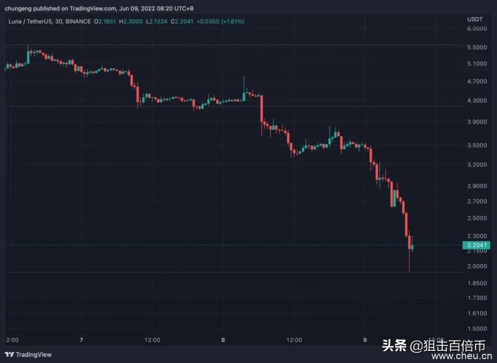 Kwon突如其来的举动,或许也造成投资者的恐慌,已经连续多日缓慢下跌的LUNA在今(9)日零点时,从3.53美元快速下挫,一度在稍早七点半左右跌至1.95美元,重跌近45%;截稿前稍有上涨,现报:2.2美元。