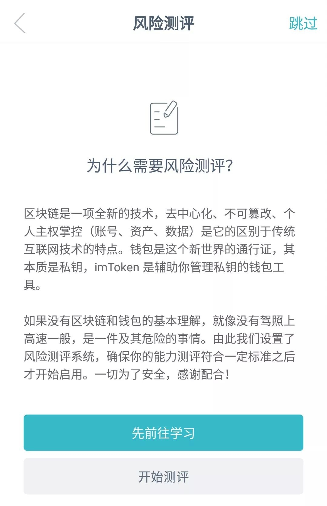 建议初学者点击“先前往学习”进行基础知识学习,并点击“开始测评”进行风险测评。熟练掌握者可点击右上角“跳过”直接进入钱包创建。