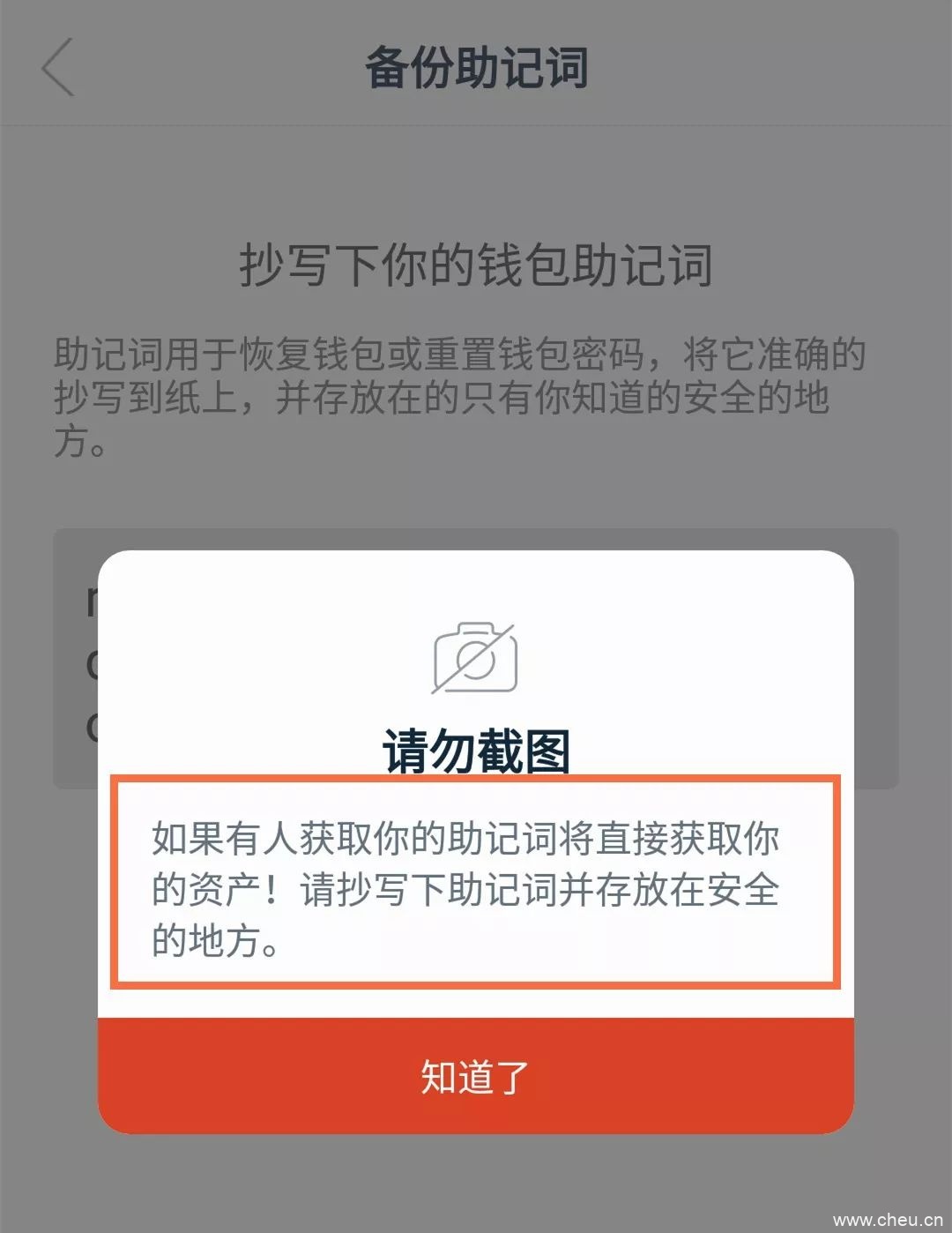 用纸笔按顺序工整抄下钱包助记词并收藏好。如钱包助记词遗失,别人有可能通过钱包助记词获取你的数字资产!且钱包助记词是发生手机遗失、删除钱包等意外状况时找回钱包里数字资产的最后方法。
