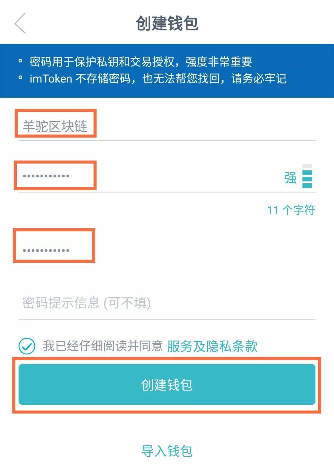 输入钱包名称及密码(务必牢记钱包密码,后续转账时也将用到),创建钱包