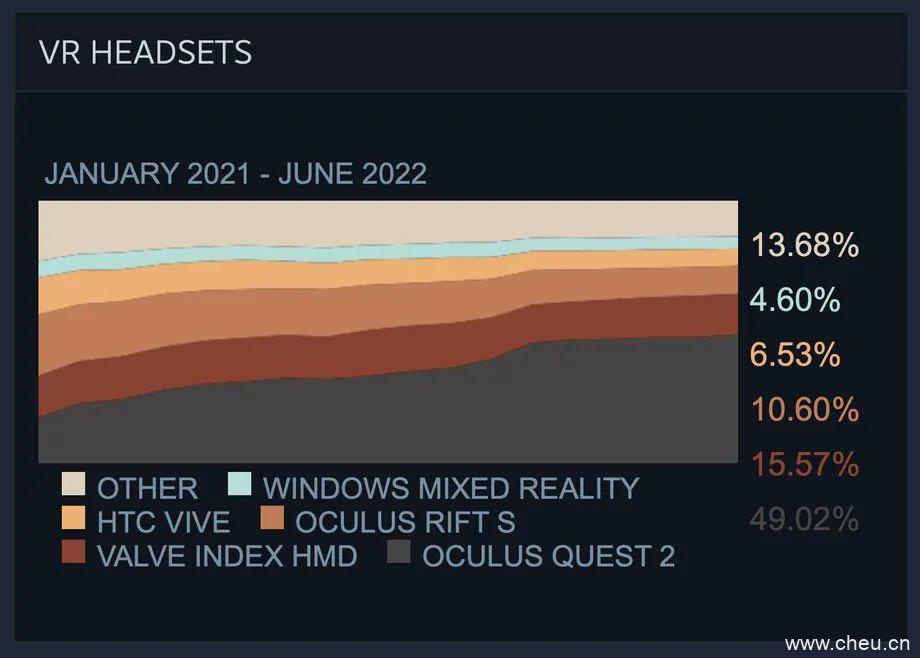 Quest 2 是目前市面上占据市场主导地位的一款头显。据市场调研公司 IDC 估计,Quest 2 在 2021 年的 VR/AR 市场中占有 78% 的份额,而 Steam 的 2022 年 6 月硬件统计显示,在 Steam 游玩 VR 内容的用户中有 49.2% 都使用 Quest 2.
