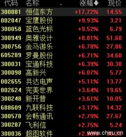 周五早盘,元宇宙概念股异动拉升,截至发稿,恒信东方大涨超17%,宝鹰股份涨停,蓝色光标涨超9%,奥雅设计、金马游乐、罗曼股份、宝通科技等跟涨。