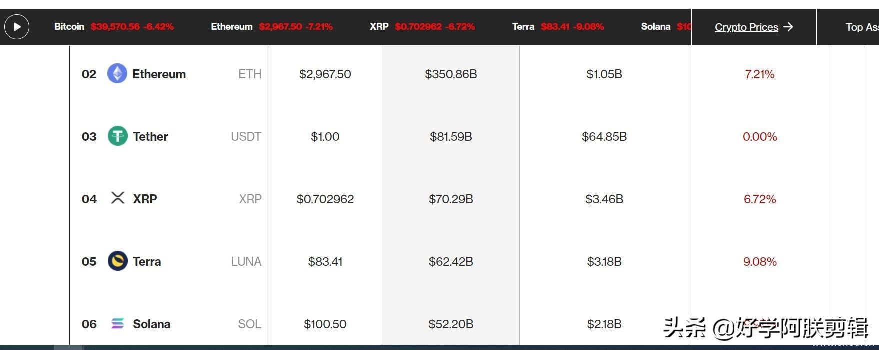 Ripple 下跌 6.69%,按市值排名第 7 的 Solana 分别下跌 9.94%。