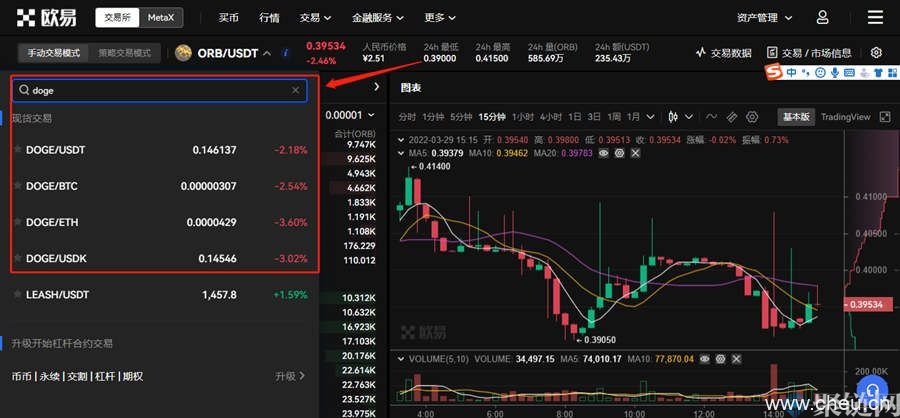 2、在交易对中输入doge,就会出现欧易交易所支持的相关交易对