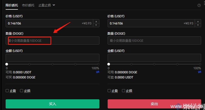 3、点击交易对后会出现交易界面,根据需求购买和交易doge币,并且大家还可以知道,欧易交易所支持的doge币最低交易数量是10doge币。