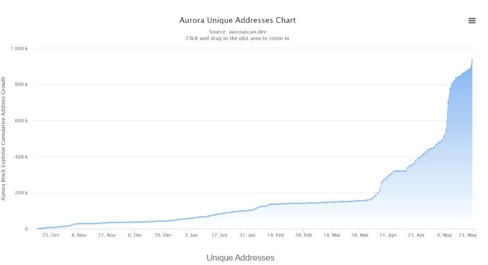 Aurora 的 TVL 在 5 月达到峰值 1.4b,后续因为大盘回落趋势下降到 411m。TVL 和独立地址增速有较强关联性。和 Arbitrum