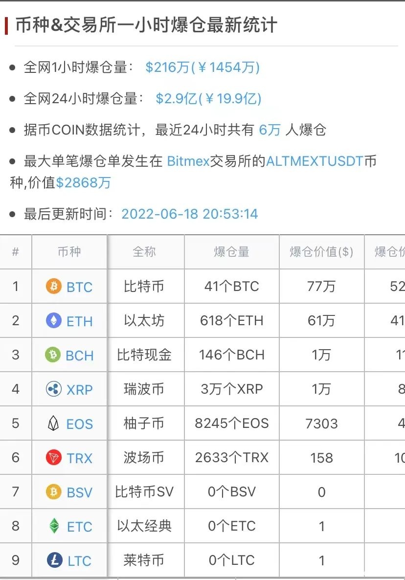 币界数据显示,截至北京时间6月18日21时,虚拟货币合约一日内共爆仓近20亿元人民币,波及6万人,其中最大单笔爆仓高达2868万元。