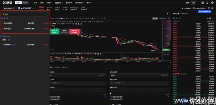 2、在交易对中输入RVN,就会出现欧易交易所支持的相关交易对