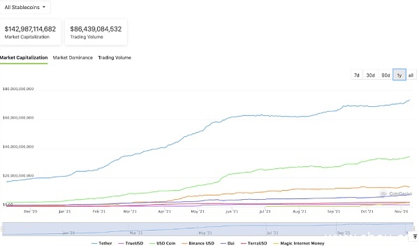 在达到1429亿美元的市场规模时,与各国法定货币挂钩的、从区块链网络中生成的稳定币的整体市值已经从一年前的200亿美元扩张了超过6倍,在其中冲锋陷阵的当属美元稳定币USDT和USDC,前者由存在储备金争议的Tether公司发行,后者的发行方是受监管的金融技术公司Circle,双方一直处于市场规模的竞争态势中。