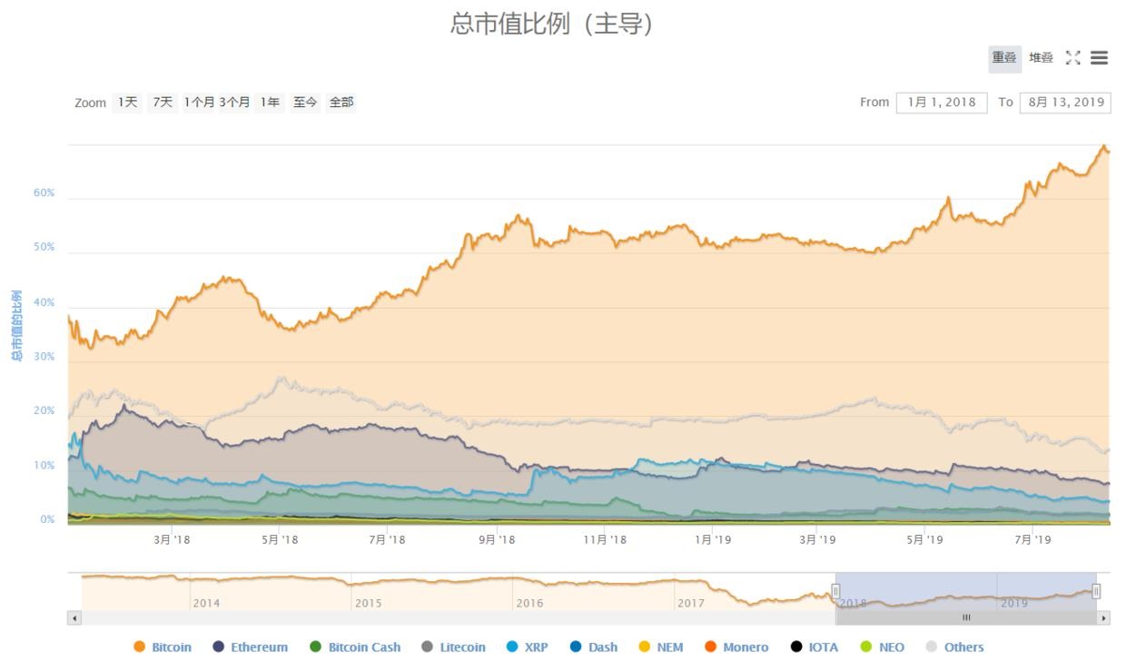 (2018—20198月份各主流货币占加密货币总市值的比例图)