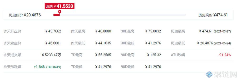 2021年4月27日ERN币出现历史最高价为74.8046美元,2021年5月24日ERN币出现历史最低价为3.2291美元。