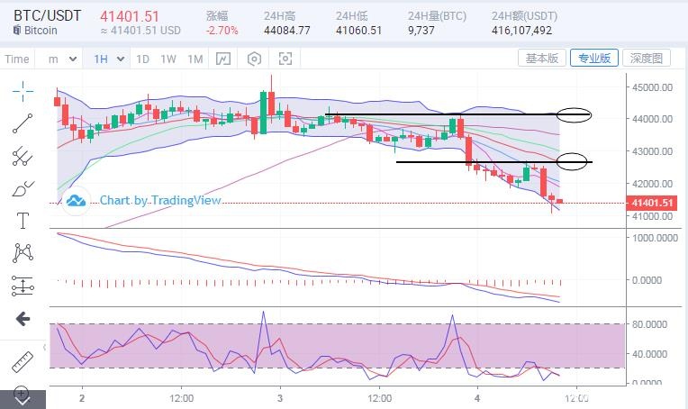 比特币昨晚反弹44100附近后又跌下来,尾盘凌晨持续走弱震荡,如我昨晚预期分析所说,没有突发消息面刺激的话后市比特币持续走弱将会继续向下调整,而在经过凌晨几个小时的横盘震荡后,比特币早间也是再度急跌触及41000附近,跌幅近3%。