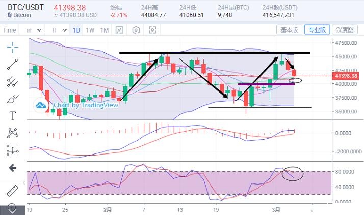 昨晚分析所讲的出现放量下跌下方较强防守支撑就是41000位置,该位置是日图级别中轨附近,这个位置一旦守不住,那么日图的“M双顶”将会带动后市继续走跌,大概率又会朝37000-35500区域而去,从而抹平前一周的涨幅。