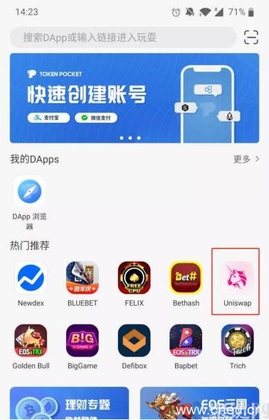 1、我们可以通过多链钱包TokenPocket来连接Uniswap进行交易。打开TP钱包,点击发现进入发现界面后,找到Uniswap并点击进入。