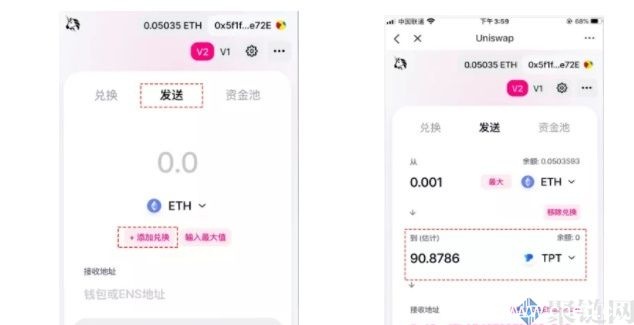 3、发送功能,既可以作为一个普通的代币转账工具,又可以实现从兑换到转账的功能。