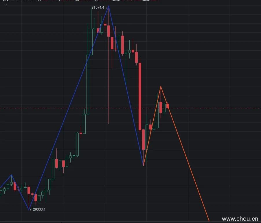 第二种情况:30分钟下跌一笔不创新低,比特来到29600附近,大饼在1750附近