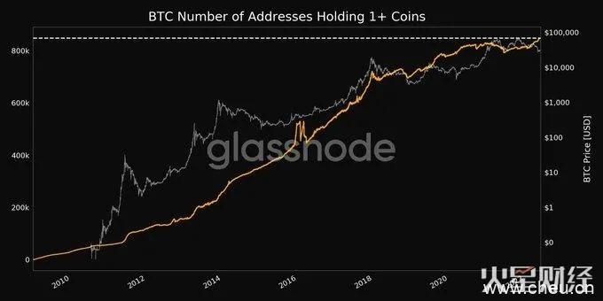 在抄底增持行为作用下,比特币的持币地址数量也大幅增加,并创下历史新高: