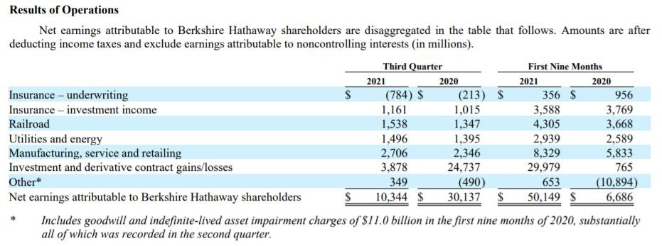 相对于疫情初期的阵痛,伯克希尔的实体业务整体还不错,最新季营收增长12%,至710亿美元。供应链压力下,伯克希尔的铁路业务取得了创纪录的收益,该公司的能源业务实现了自2009年年中以来的最高利润。同时公司的承保业务也呈现亏损扩大的状态,这也与九月初登陆的飓风艾达造成的破坏有关。伯克希尔公司出现了利润不及收入增幅的现象,公司第三季度净利润同比下降66%,至103亿美元。