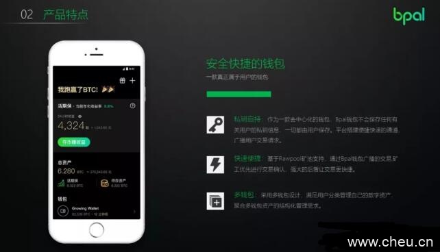 Bpal钱包由拥有全球11%算力的RawPool矿池投资,目前主打“随存随取、BTC本位,年化收益8.8—17.8%”的活期增值产品,增值来源为RawPool矿池的BTC/BCH挖矿收益。矿池RawPool采用重资产投入模式,目前在北美拥有全球单体最大的矿场,在中国四川、新疆、内蒙、宁夏等多地布局了数万台矿机,目前正在俄罗斯筹建新矿场。