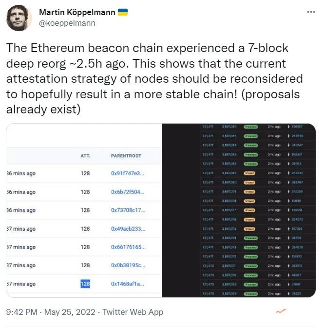 K?ppelmann表示,大约2.5小时前,以太坊信标链经历了7个区块的深度重组。这表明应该重新考虑当前节点的证明策略,Vitalik文章的“重组稳定性将在POS中优于POW”的观点分析过于乐观。多年来,我们还没有在以太坊主网上看到7次区块重组。目前还不清楚重组是由攻击引起的,还是只是网络状况。