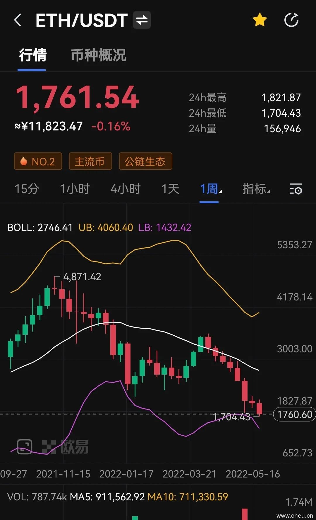 前天开始,以太坊遭遇大幅下跌行情,连续三天下探新低,到今天ETH价格跌破1704美元,创下去年7月份以来的最低价格,连续三日跌幅分别达到12.74%、11.54%、4.46%