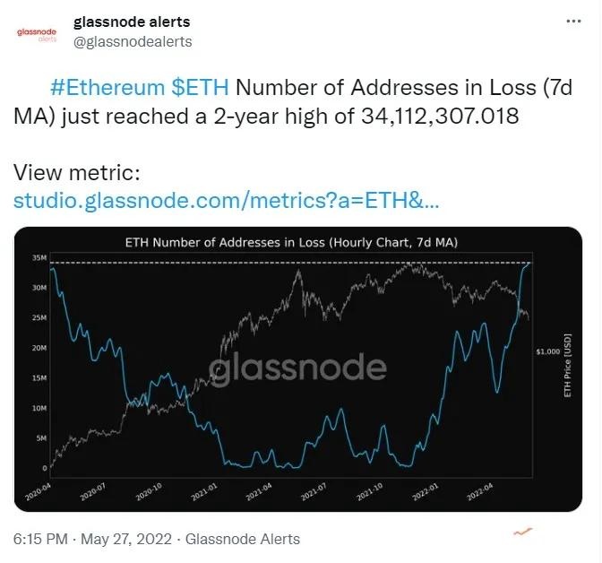 随着ETH价格持续创下新低,以太坊的盈利效应严重受挫,亏损地址创两年新高: