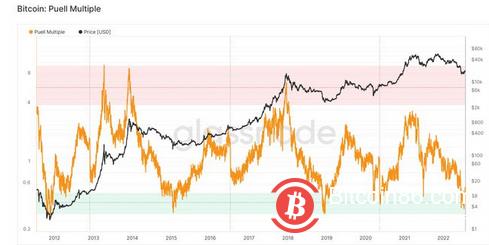 比特币形成宏观底部的第三个迹象来自另一个称为 Puell Multiple 的链上指标。