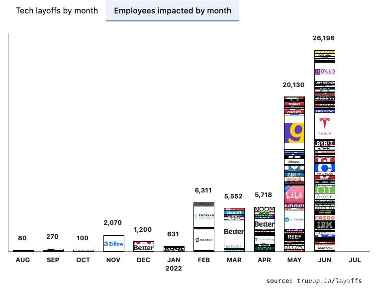 来自技术工作委员会 TrueUp的“技术裁员追踪器”显示,仅在 6 月份,就有超过 26,000 名技术员工在 200 家公司范围内裁员。